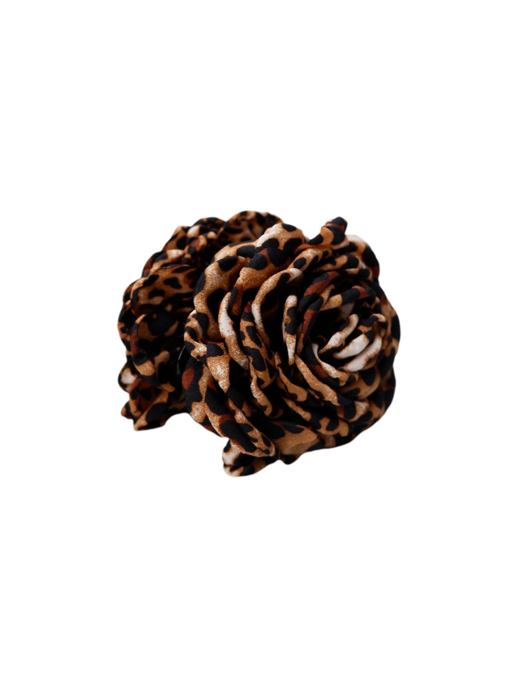 Our beautiful and very popular VILLA mega flower hair clip is now also designed in an eye-catching leopard print fabric. The large flower shape gives a statement look and gathers the hair in a decorative and practical way.