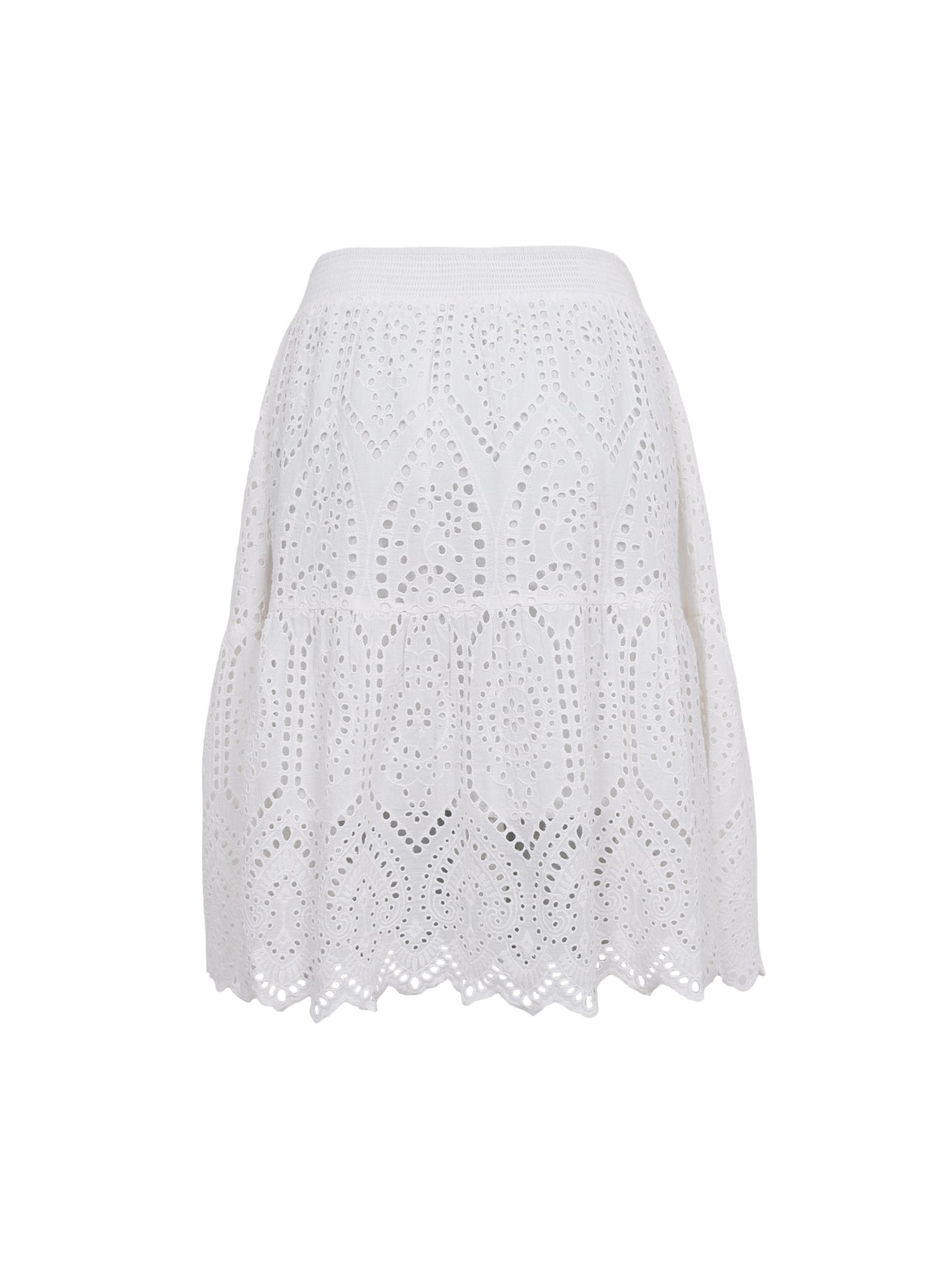 Our Ella skirt is a knee-length skirt in boho-inspired broderie anglaise with a smocked waist for a comfortable fit. The ruffle detail at the hem and embroidered hem give it a feminine look. Wear it alone or as a set with the matching Ella top.