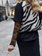 The blouse's oversized look gives it a raw and cool look, while the detailed lace sleeves bring a feminine element to the look.