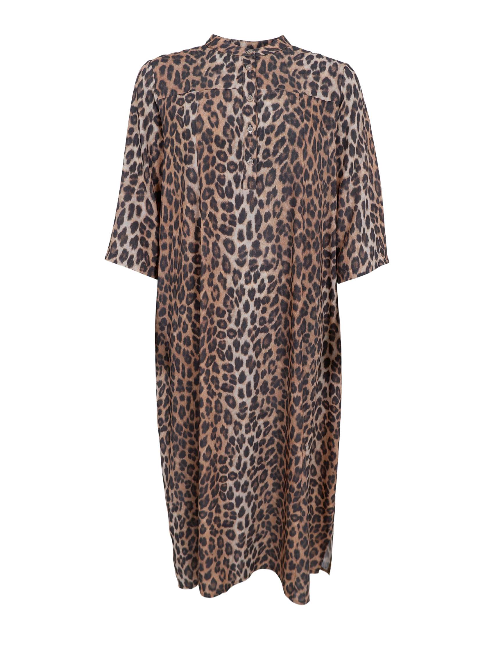 Add a touch of wild elegance to your wardrobe with this statement dress that combines comfort and edge in one design. The loose fit and practical side pockets give a relaxed and effortless look, while the small stand-up collar and front button closure add a sophisticated finish. Short sleeves and a light, flowy fabric make it ideal for both sunny days and layering on cooler days.