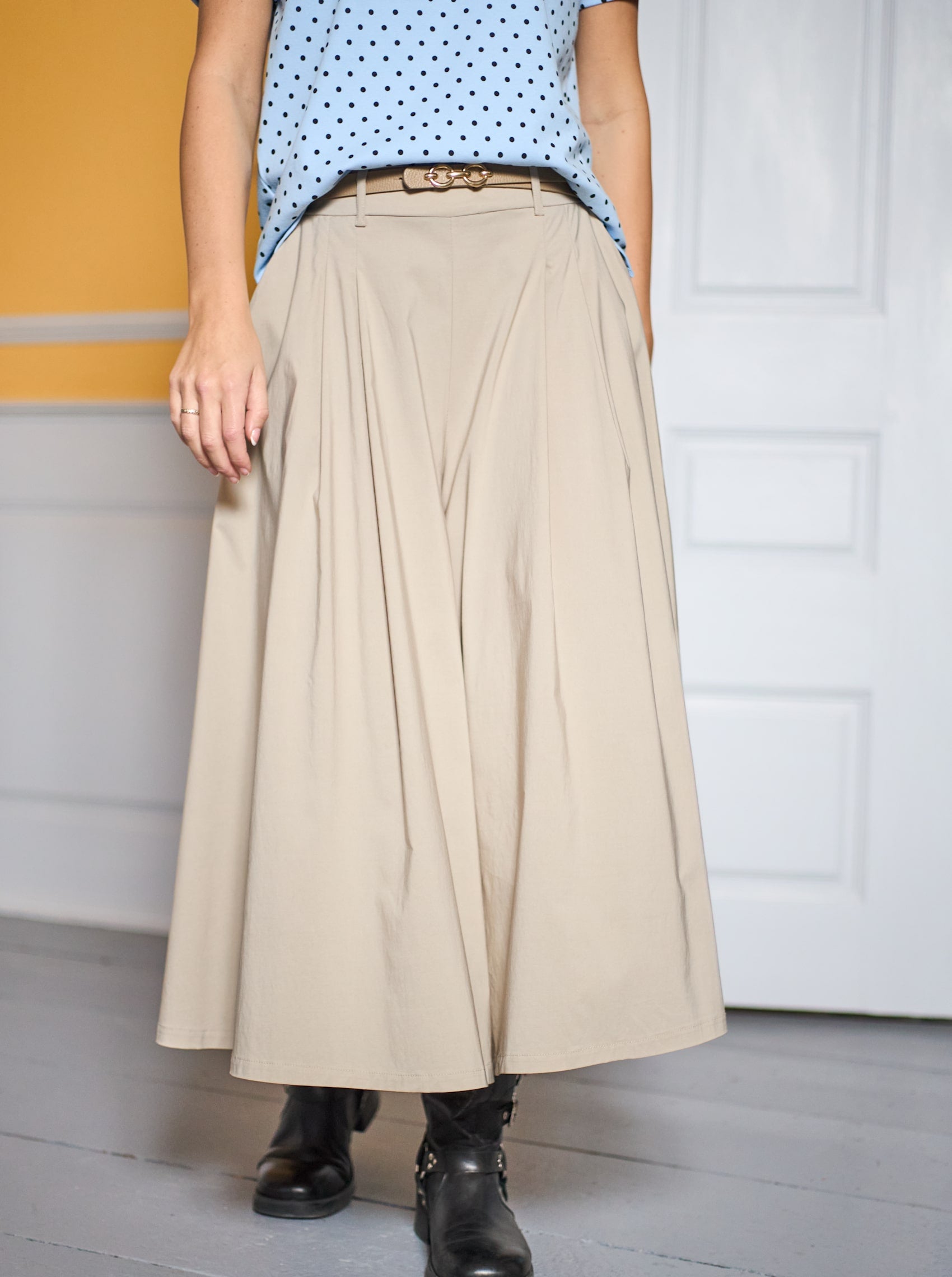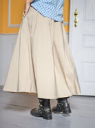 Coolest trouser skirt with an elegant A-shape with wide pleats that give a nice fall and extra freedom of movement. The skirt is in principle a pair of wide-legged trousers, but is designed so that they look like a skirt. Designed with belt loops and elastic at the back of the waist for a comfortable fit.