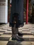Elegant dress with thin straps and beautiful lace edges at the top and bottom. The dress has a nice straight fit that falls easily and gives a sophisticated look. The soft, slightly shiny quality adds an exclusive look, perfect for both festive occasions and evening wear.