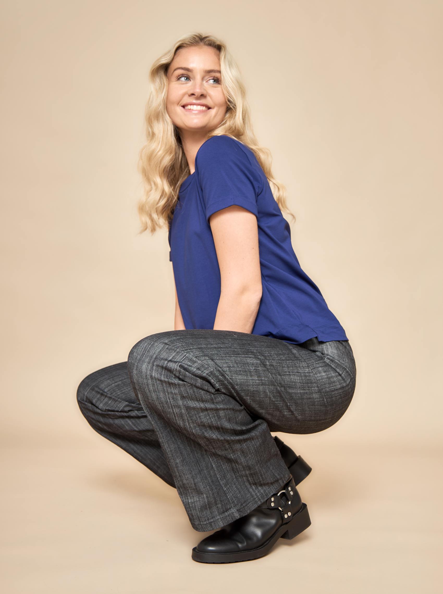 Our short-sleeved May t-shirt is a lovely loose-fitting cotton tee with a round neck and a small pleat on the sleeves. The blouse is solid-colored and completely simple, which makes it incredibly versatile, as it can be combined with almost anything.