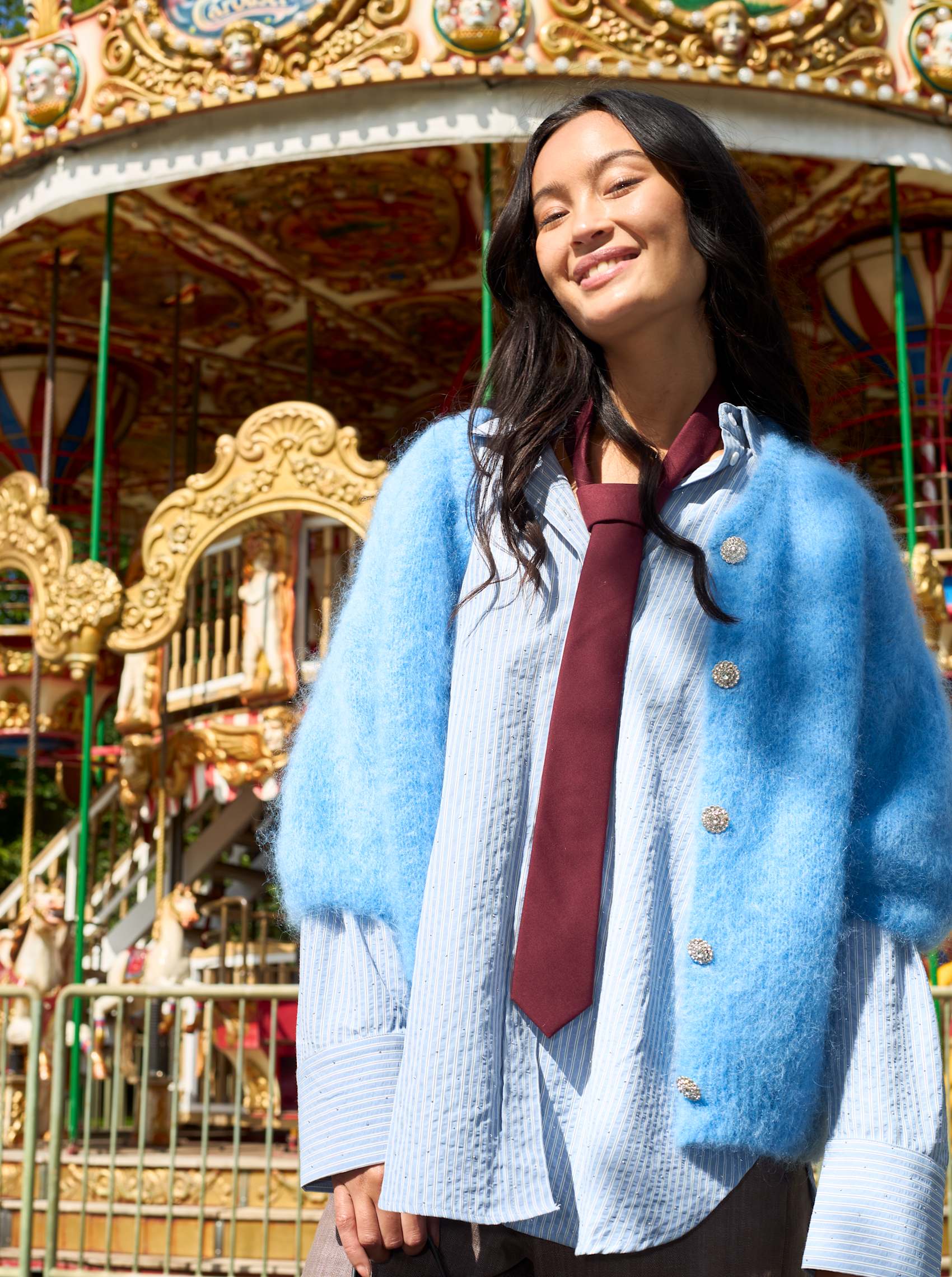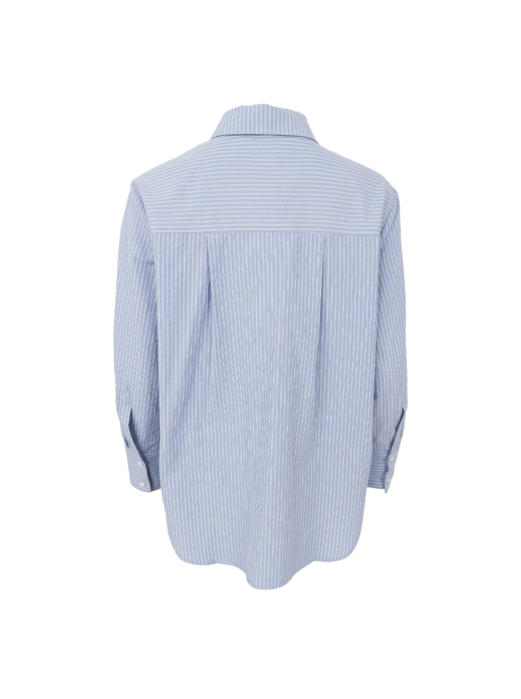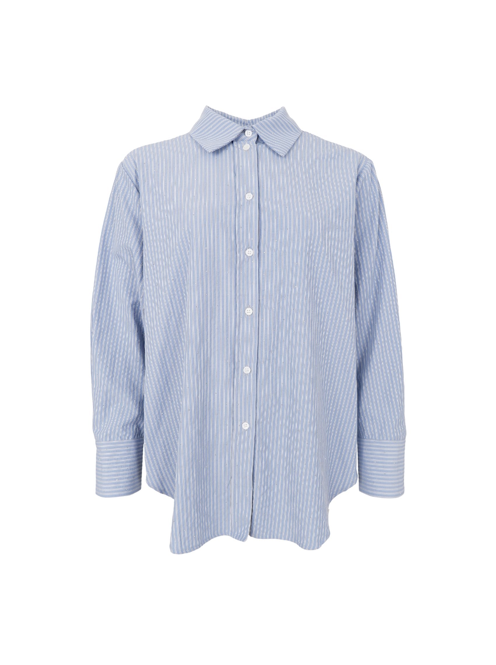 The Starry shirt is an absolute must-have with its many fine details and modern expression. The shirt is an oversized striped seersucker shirt that has the finest small rhinestones all over it.