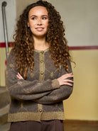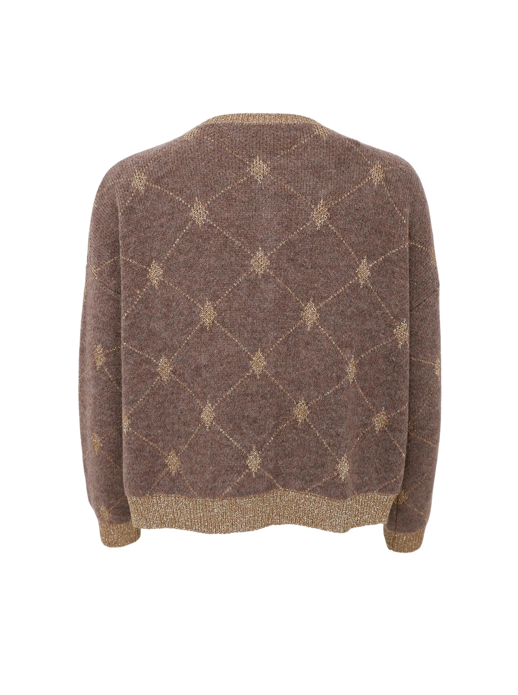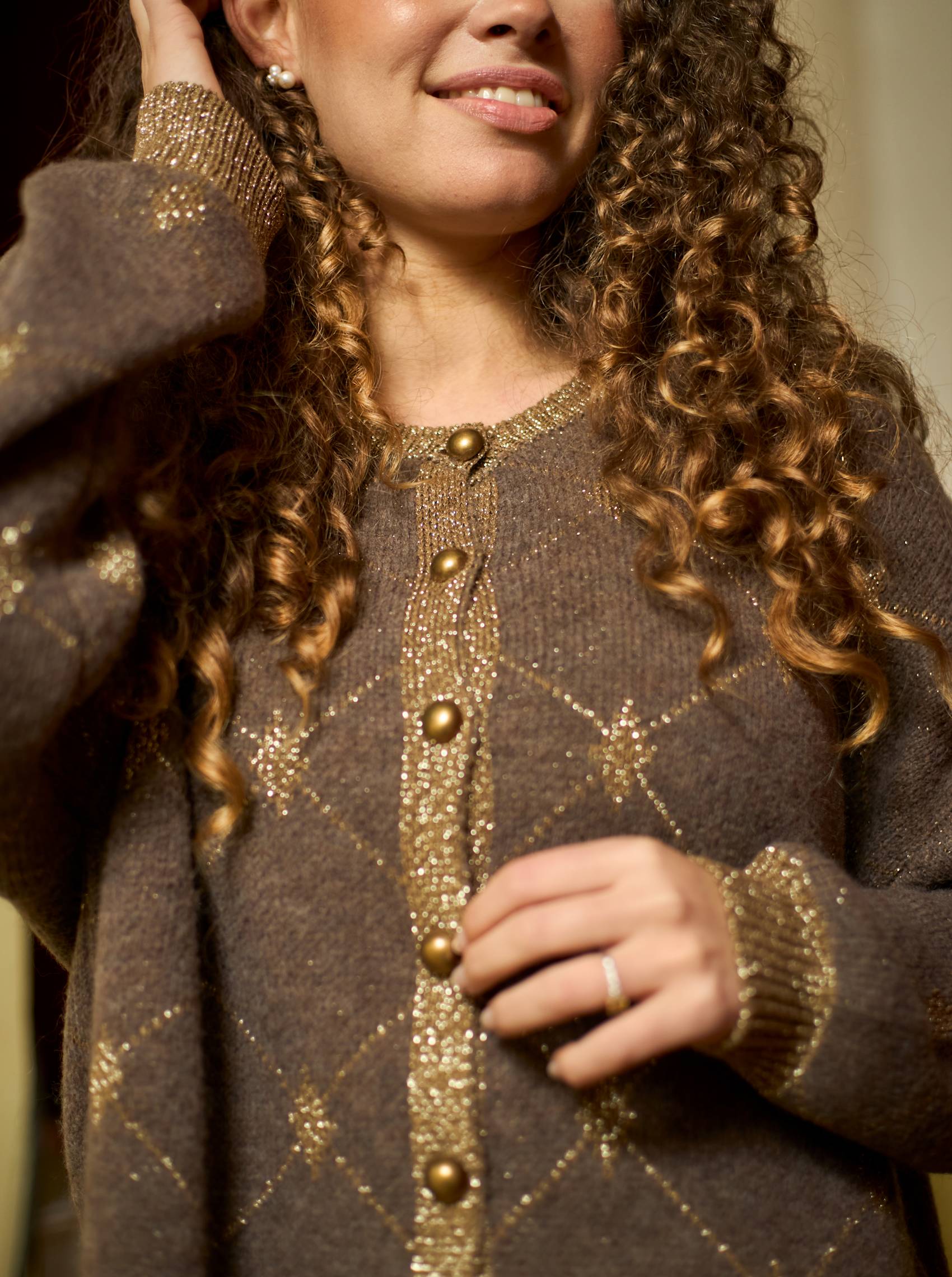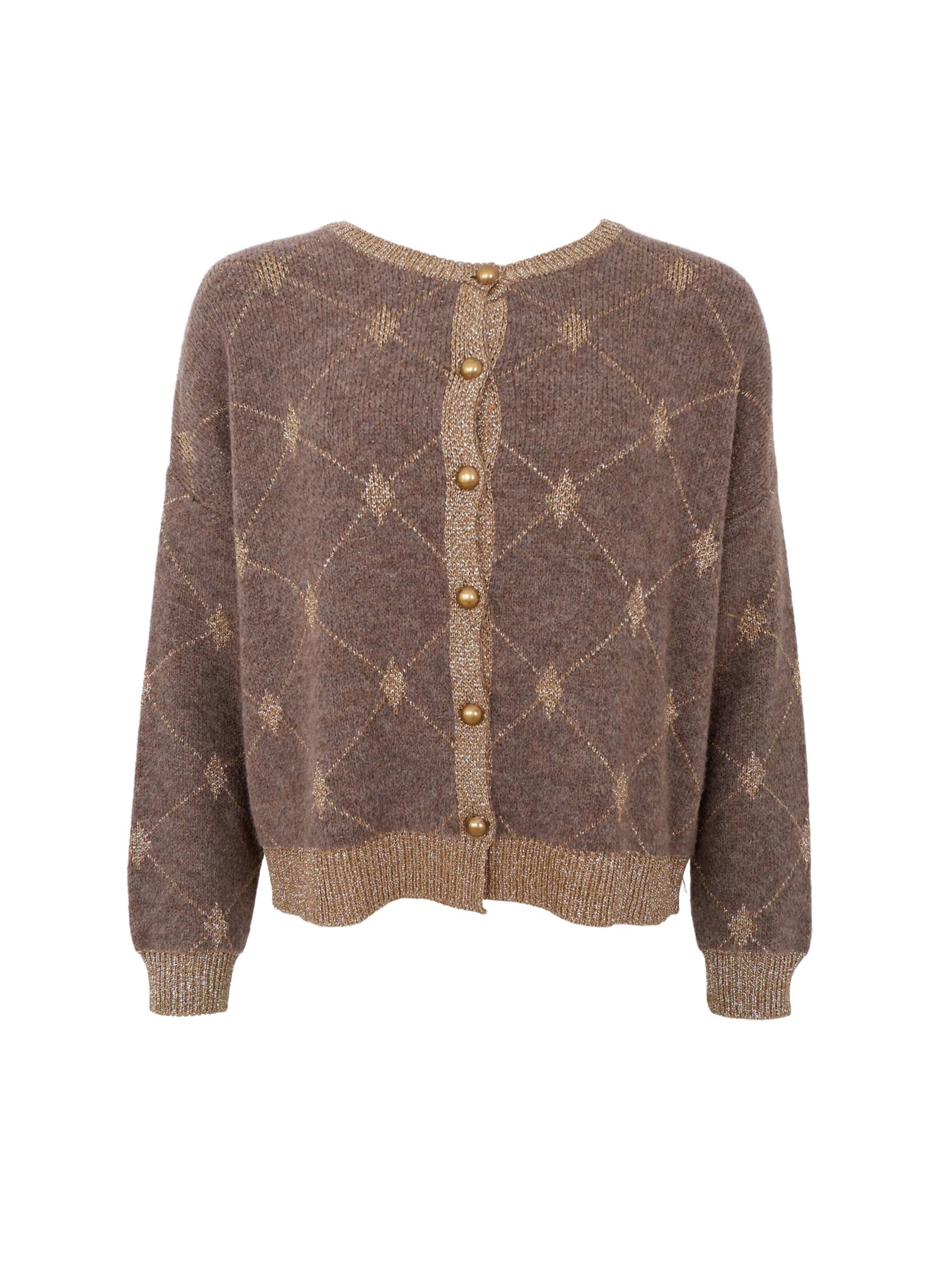 Elegant cardigan in soft knit with a subtle pattern and golden details. The cardigan has a classic fit with a round neck, ribbed edges and beautiful golden buttons at the front, giving a feminine and exclusive look. The fine lurex thread at the edges adds a touch of shimmer.