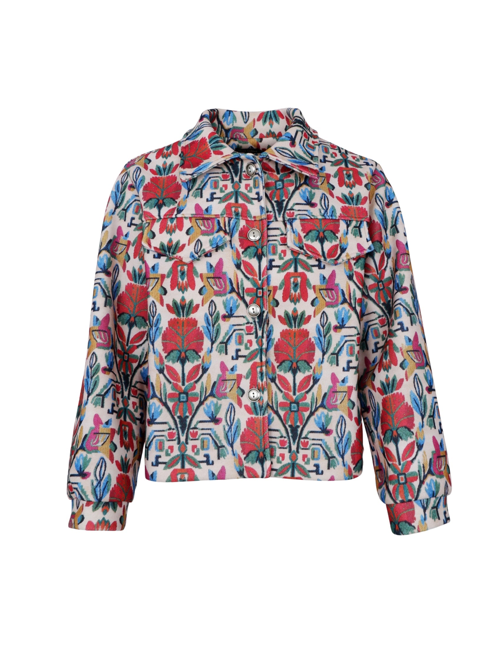 The Panama jacket is a short jacket designed with a colorful all-over print that gives a distinctive and decorative look. The model has a straight cut, classic collar and button-through closure, which creates a balanced combination of structure and lightness. The jacket works perfectly as a light layer and can be easily styled over simple basic styles for a complete and modern look.