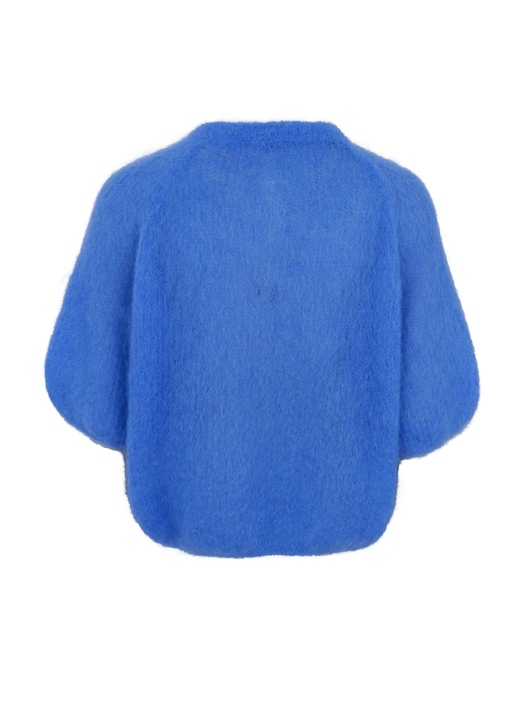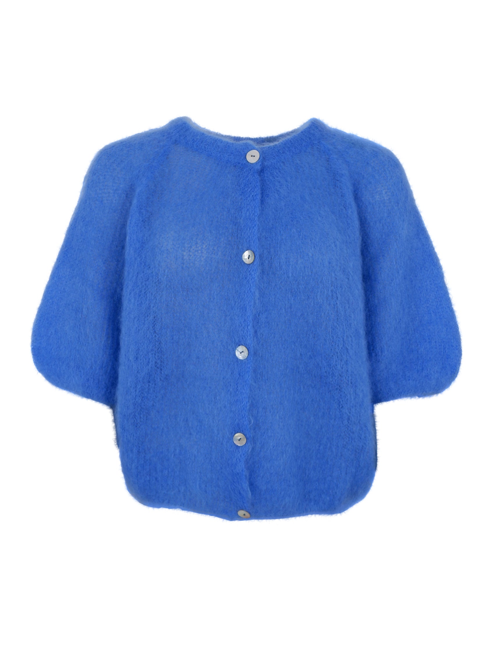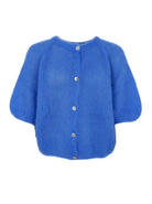 This Bjoerk cardigan is knitted in a light and fluffy quality that gives an exclusive and feminine look. The model has a round neck and short, puffed sleeves, which create a modern and relaxed silhouette. The cardigan closes at the front with fine buttons, emphasizing the simple and elegant design.