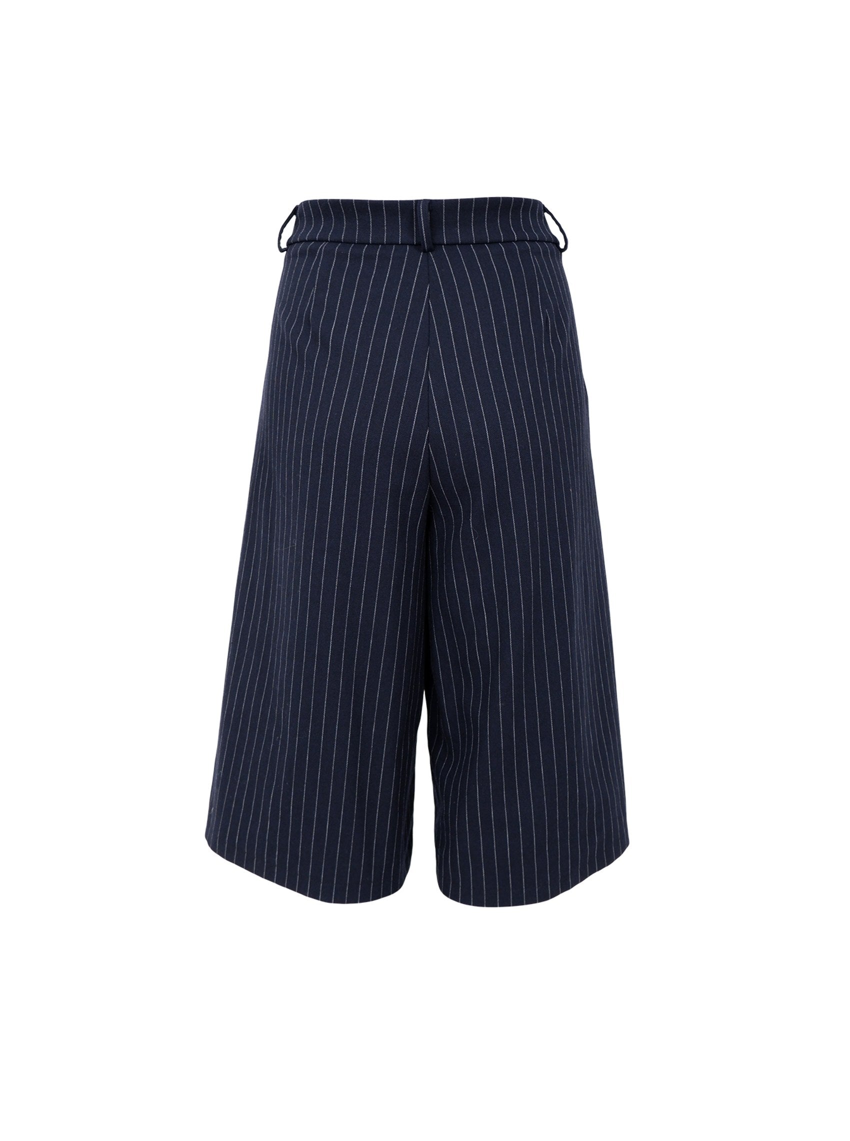 Stylish long shorts in navy with fine stripes. The shorts have a loose, wide fit with pleats at the front for an elegant hem. Designed with belt loops, side pockets and a classic button and zip fastening. Style them with tights and boots in the fall for a cool and trendy look.