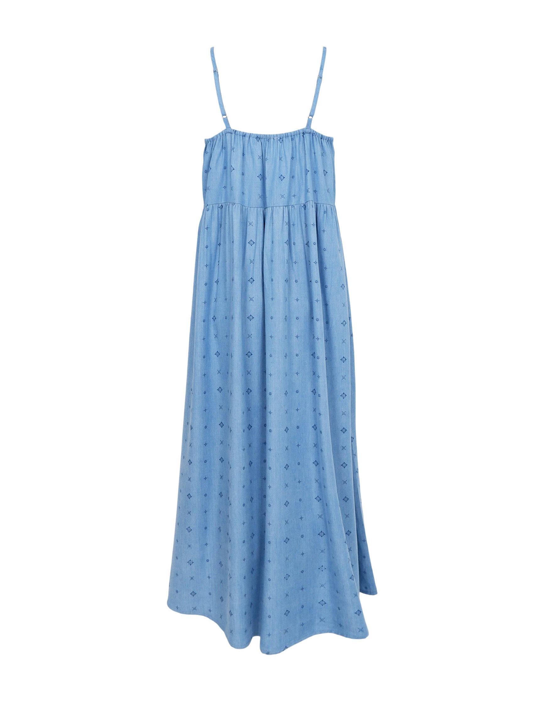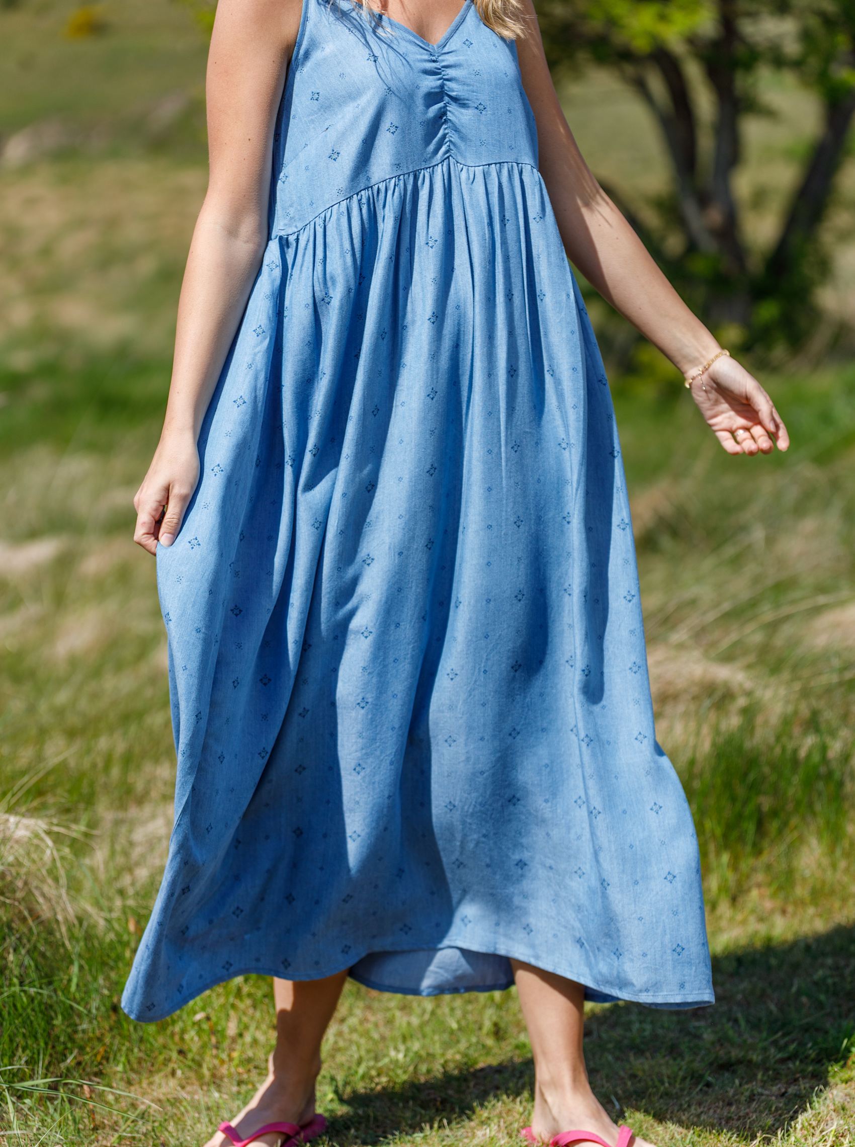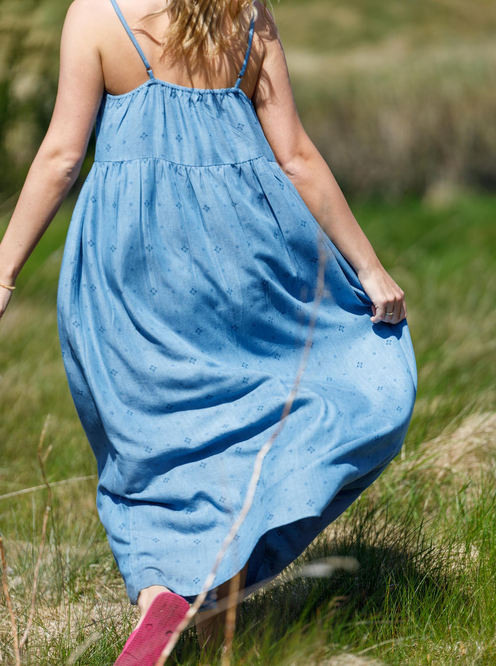 Our Lyra dress is a beautiful maxi dress with narrow, adjustable straps and a slight gather effect at the bust. The dress is made of a light printed fabric that falls beautifully and gives a feminine and summery look - perfect for warm days and casual occasions.