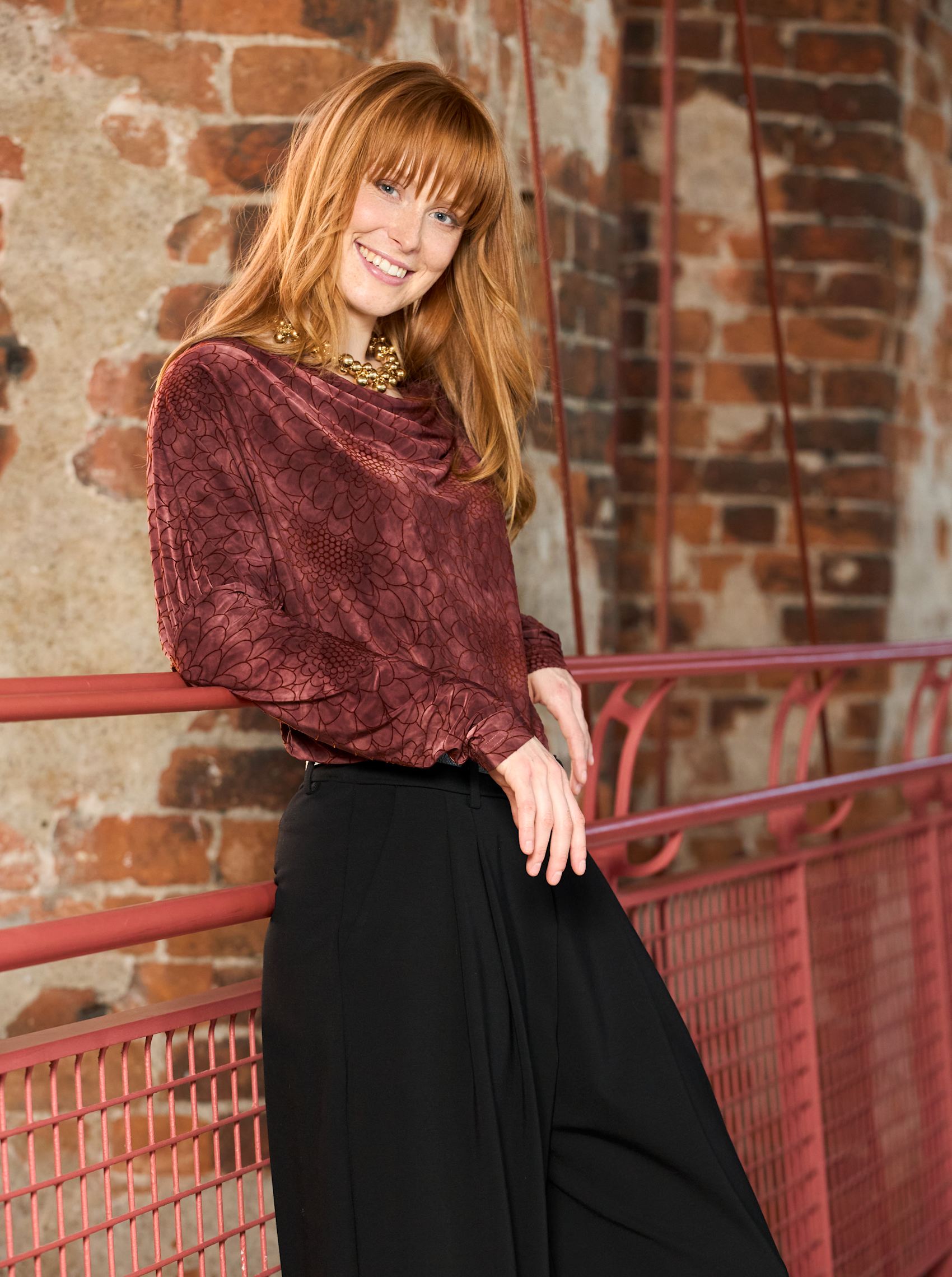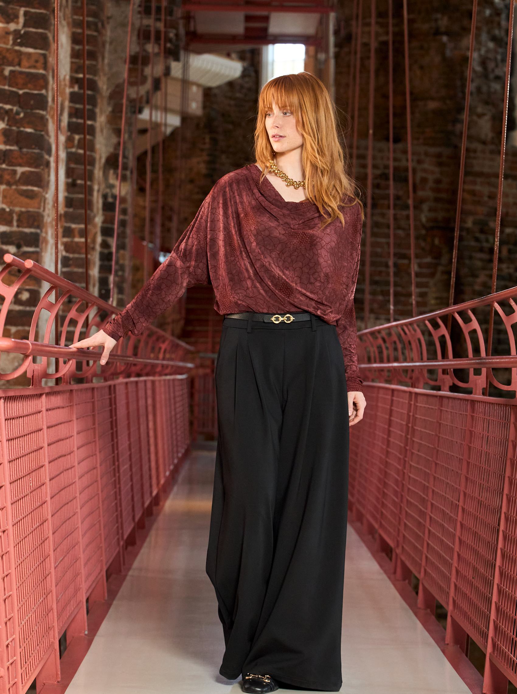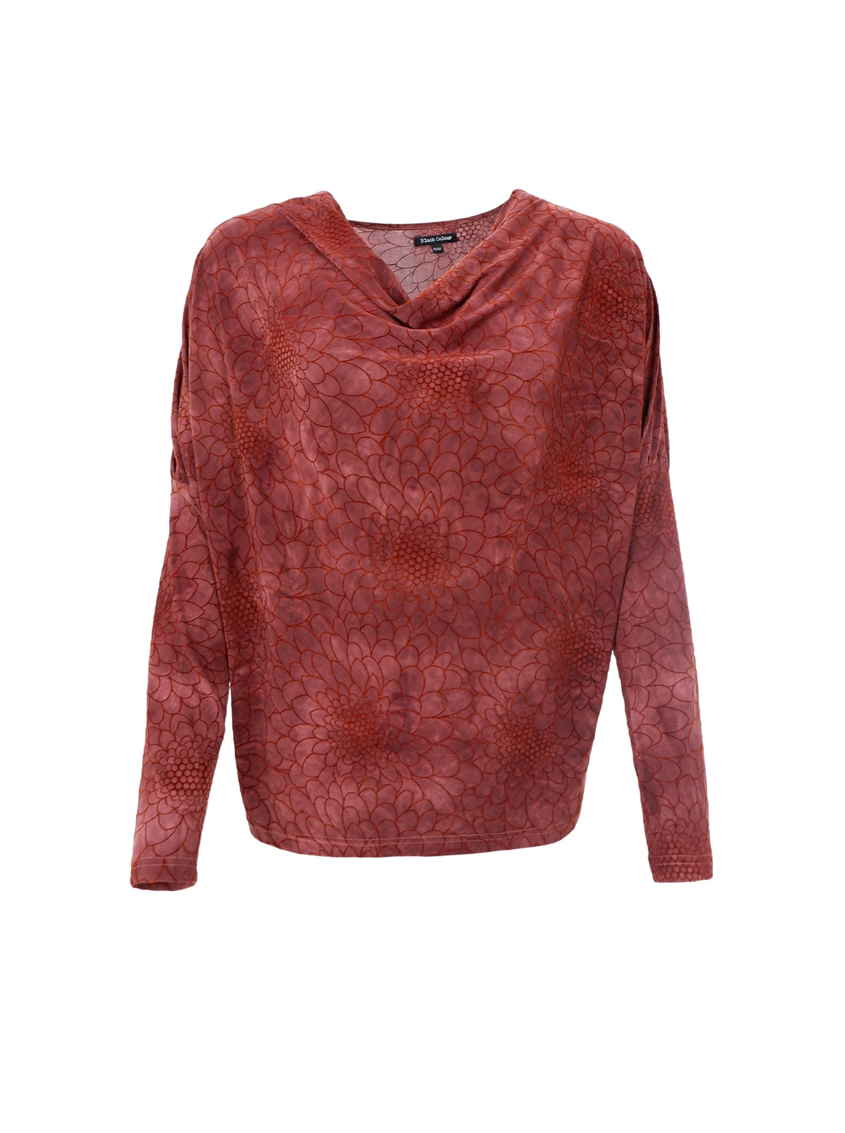 Light and elegant blouse with long sleeves, a subtle floral pattern and a beautiful draped neckline. The blouse is perfect for adding a feminine touch to festive occasions.